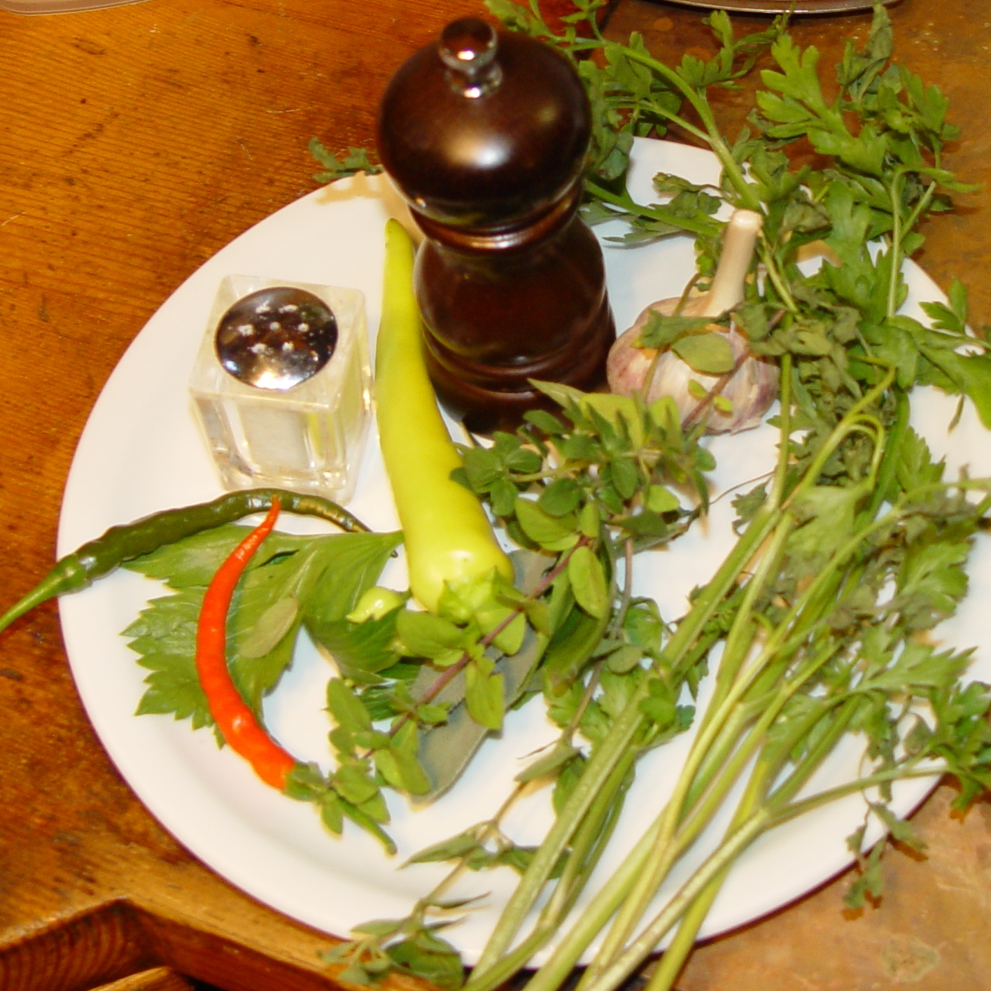Lementem a veteményesbe, mit hozzak fel, és szép paprikákat találtam. Hamár ott jártam zöldfűszereket is szedtem, mert az kell hozzá.