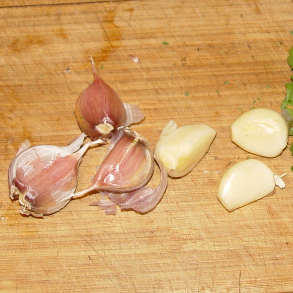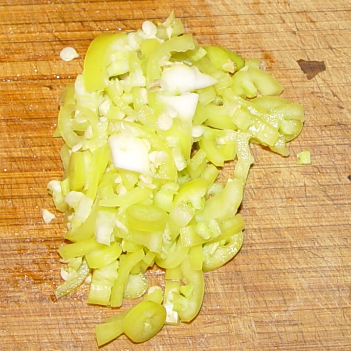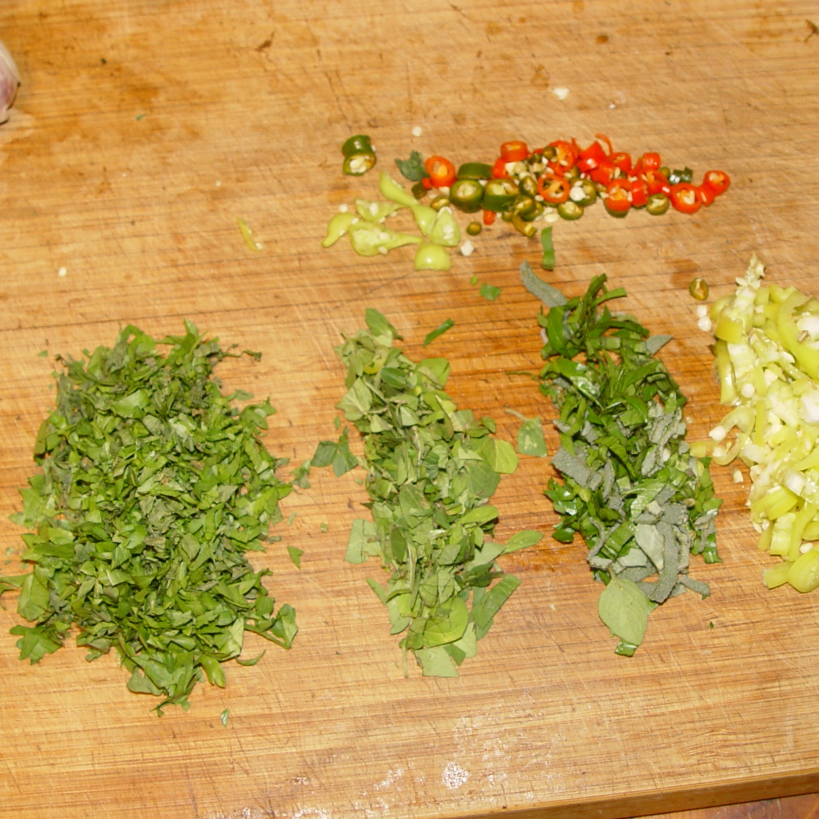 A paprikákat felkarikáztam, a zöldfűszereket megaprítottam. A fokhagymát a kés lapjával megzúztam, mert úgy könnyebb meghámozni.