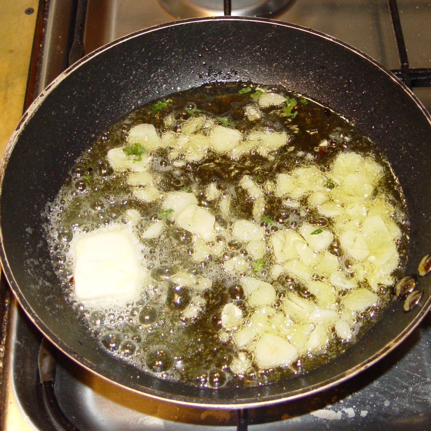 A serpenyőbe hozzáadtam a vajat, mert úgy selymesebb lesz. Ment bele a fokhagyma. Micsoda illat áradt a konyhában!!! Arra azért vigyáztam, hogy ne égjen meg, mert sajnos hajlamos rá. A tészta meg is főtt, így a főző léből kimenekítettem egy decinyit, és daráltam a tésztára kevés borsot..
